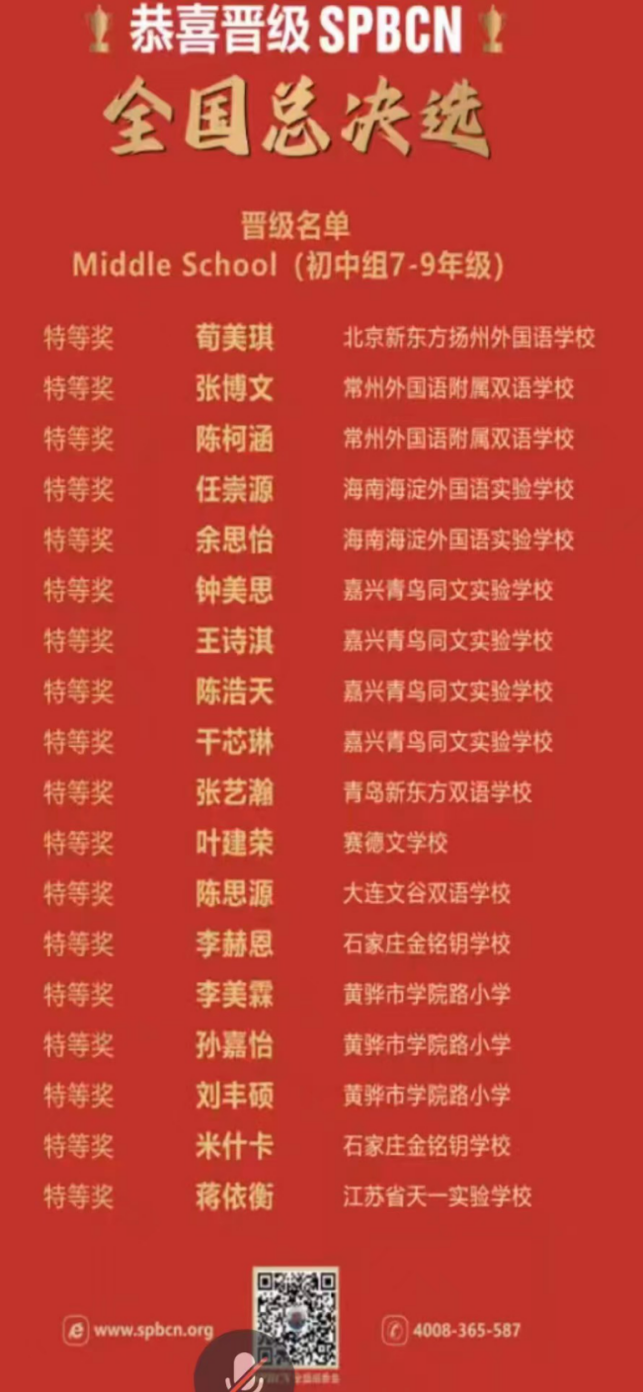 作為浙江省個人賽區(qū)派出選手最多的學(xué)校,我們有4名優(yōu)秀選手在五一期間前往北京參加了全國總決賽。在全國Spelling Bee個人賽初中組的百人角逐中,經(jīng)過多輪激烈競爭,我校的4名選手最終躋身全國68強,斬獲卓越獎項,為他們的學(xué)習(xí)生涯又增添了一枚重要的獎杯!