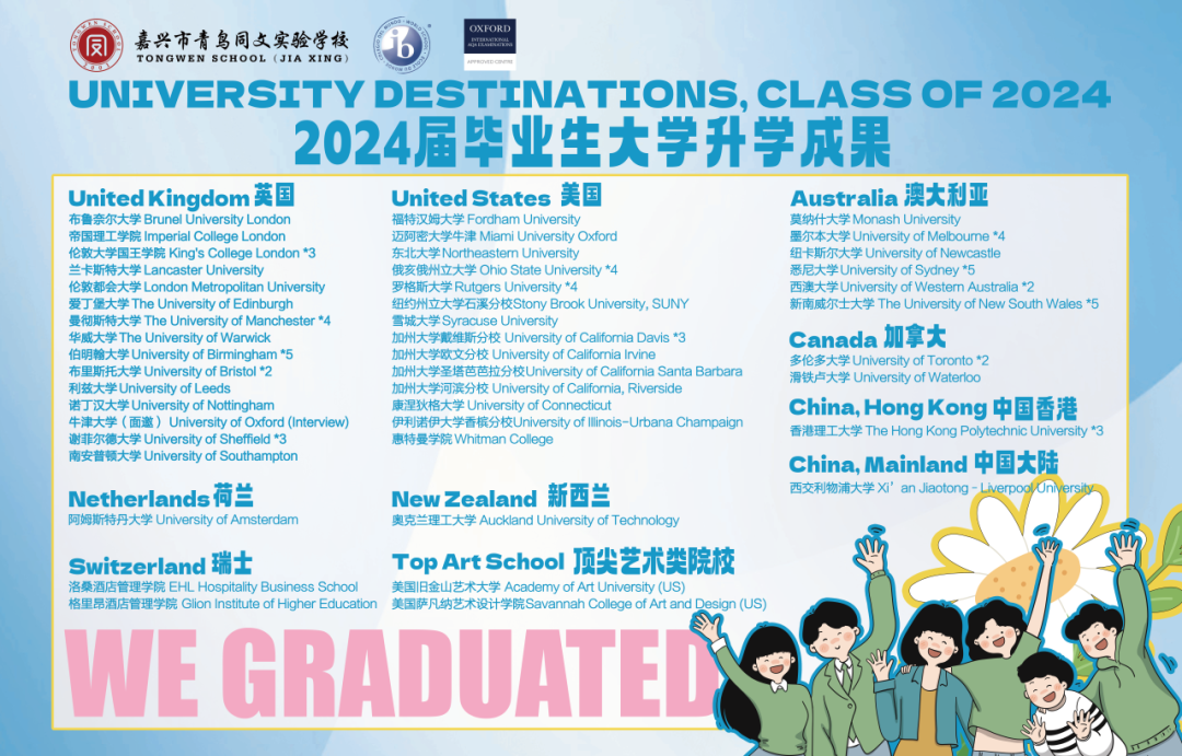 截至2024年6月10日嘉興市青鳥(niǎo)同文實(shí)驗(yàn)學(xué)校第6屆畢業(yè)生向英國(guó)、美國(guó)、中國(guó)香港、澳大利亞、加拿大、新西蘭、法國(guó)、日本等國(guó)家或地區(qū)的院校遞交了申請(qǐng)。在目前已公布的結(jié)果中,共計(jì)獲得125份錄取,累計(jì)約340,700美金獎(jiǎng)學(xué)金。專(zhuān)業(yè)涵蓋金融與會(huì)計(jì)、市場(chǎng)營(yíng)銷(xiāo)、酒店管理、機(jī)械工程、數(shù)學(xué)、統(tǒng)計(jì)學(xué)、數(shù)據(jù)科學(xué)、計(jì)算機(jī)科學(xué)、經(jīng)濟(jì)學(xué)、環(huán)境科學(xué)、交互設(shè)計(jì)、平面設(shè)計(jì)等。